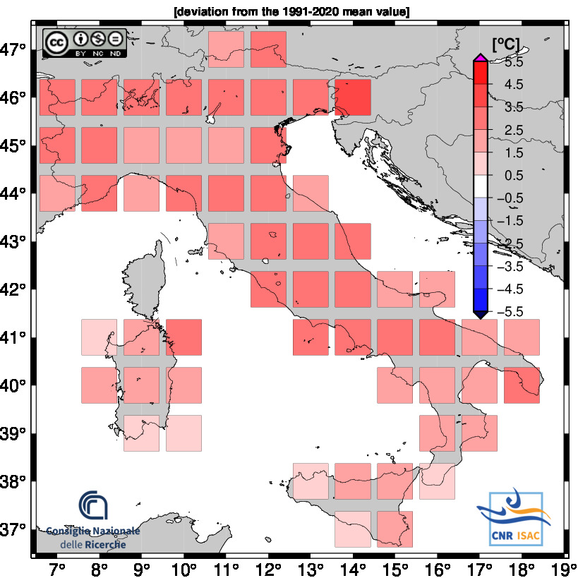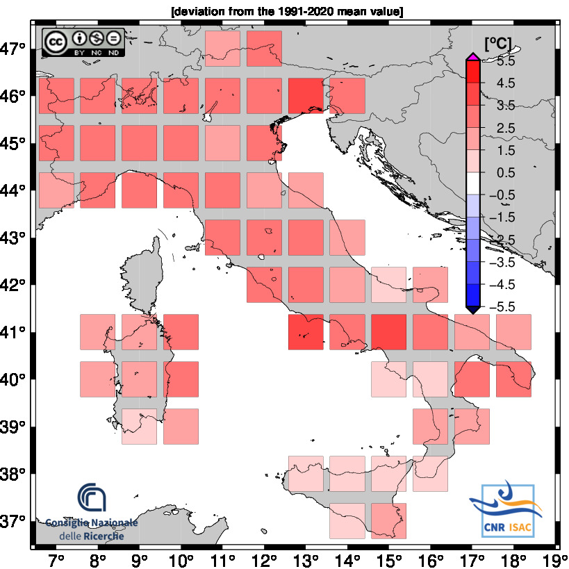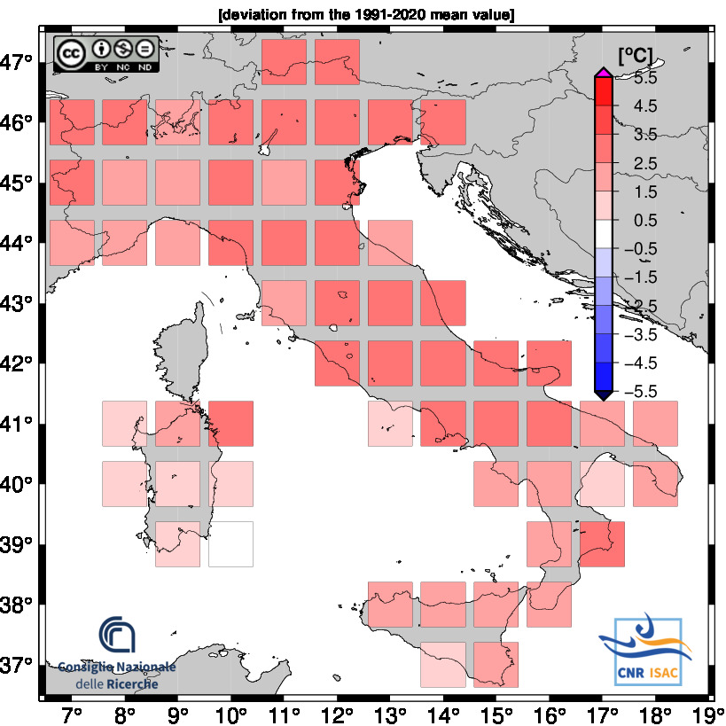 Per quanto riguarda le anomalie di temperatura massima, al Nord l’anomalia è stata di +2,78°C; al Centro l’anomalia è stata di +2,49°C, mentre al Sud l’anomalia è stata di +2,22°C.