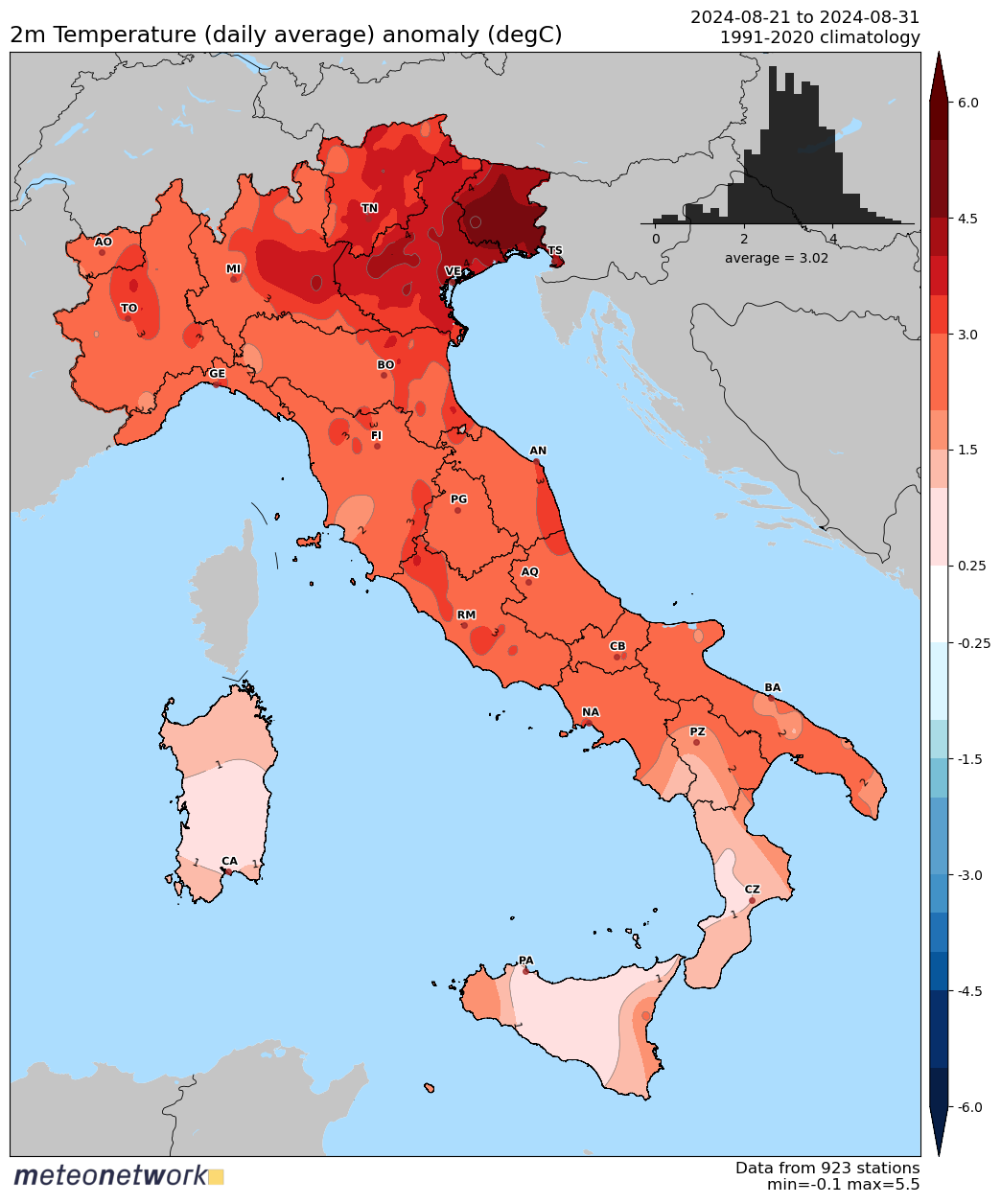 Figura 4. Anomalie temperatura media terza decade di agosto – fonte https://www.meteonetwork.eu/it/mappe-periodiche