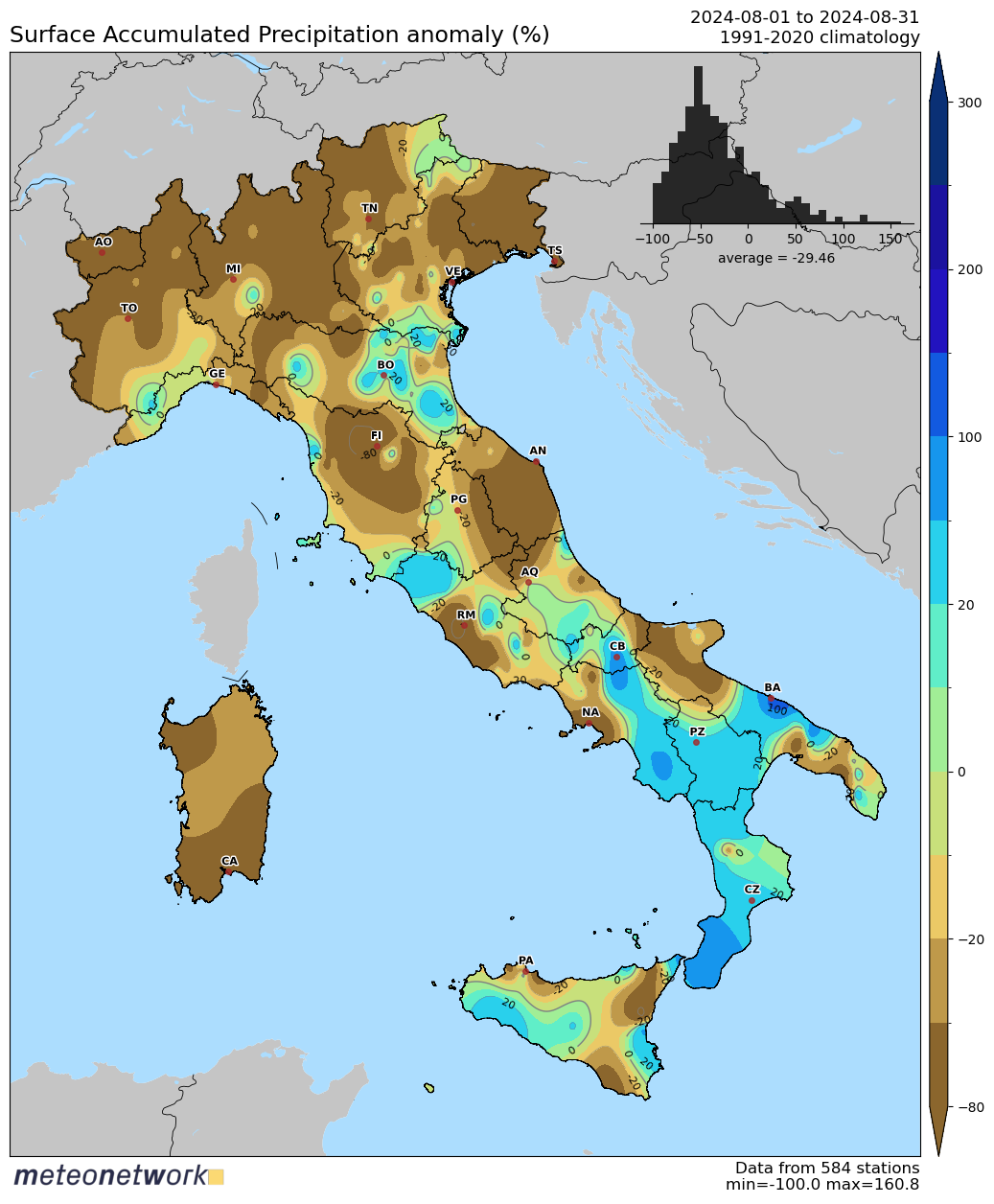 Figura 5. Anomalie di precipitazione in agosto – fonte https://www.meteonetwork.eu/it/mappe-periodiche