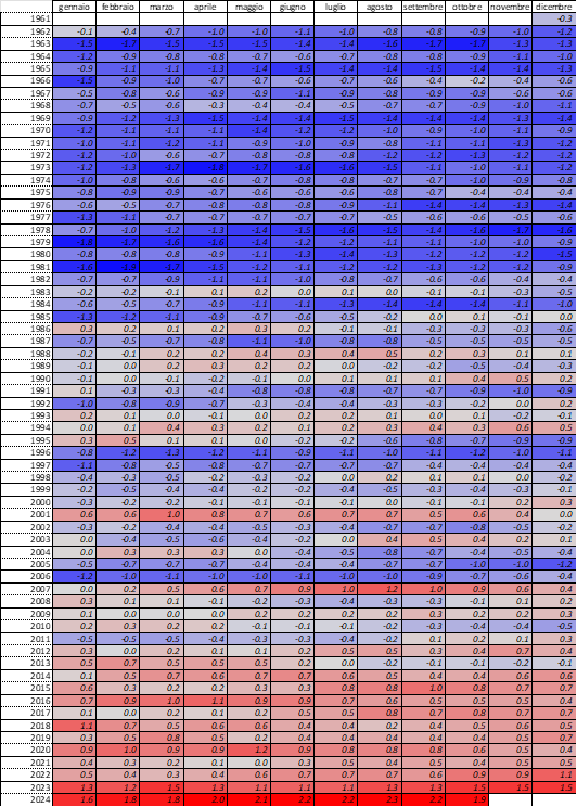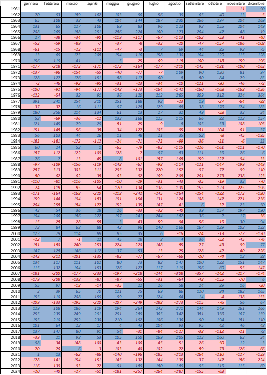 Tabella riepilogo dei valori mensili 2024, di riferimento 1991-2020 e delle anomalie.