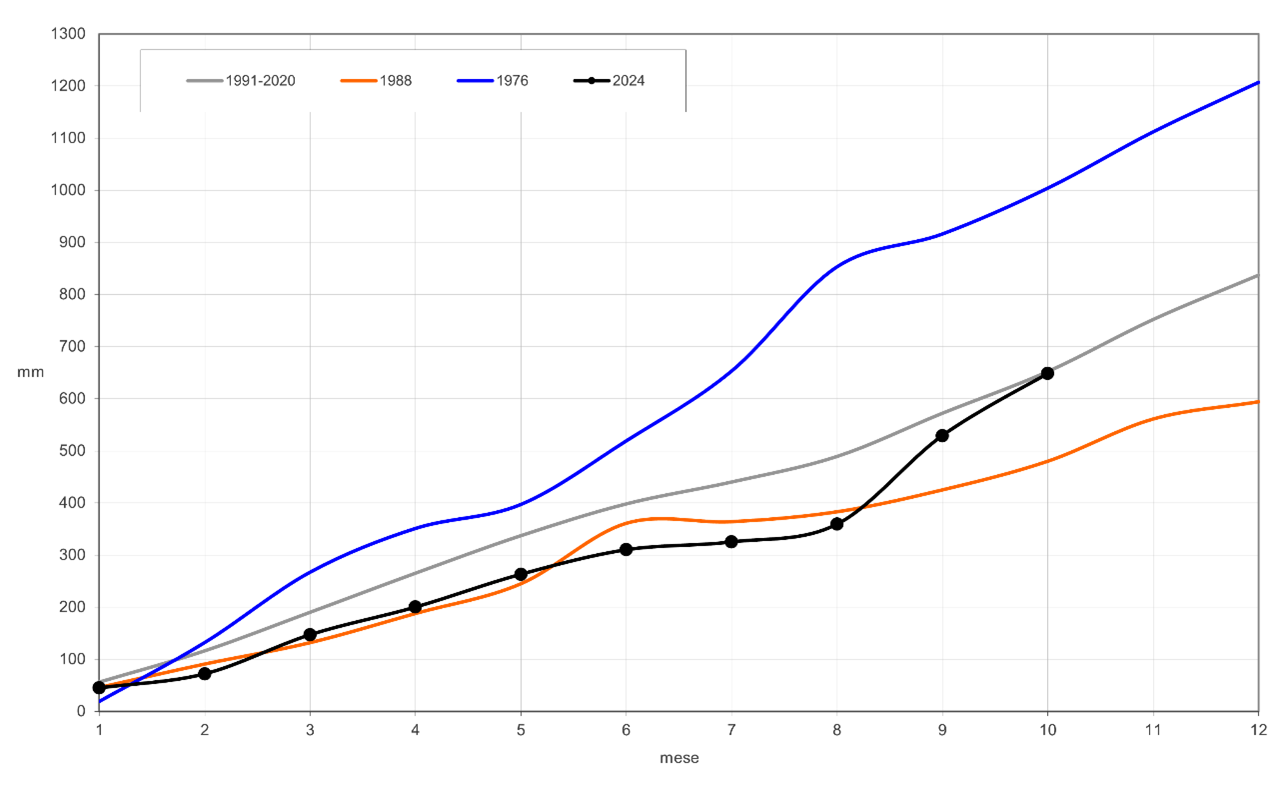 Andamento della precipitazione cumulata mensile (mm); in nero l'anno attuale, in blu l'anno più piovoso (1976) e in arancione l'anno meno piovoso (1988) dal 1961, in grigio la media 1991-2020. Con ottobre, il 2024 torna a sovrapporsi alla media storica.