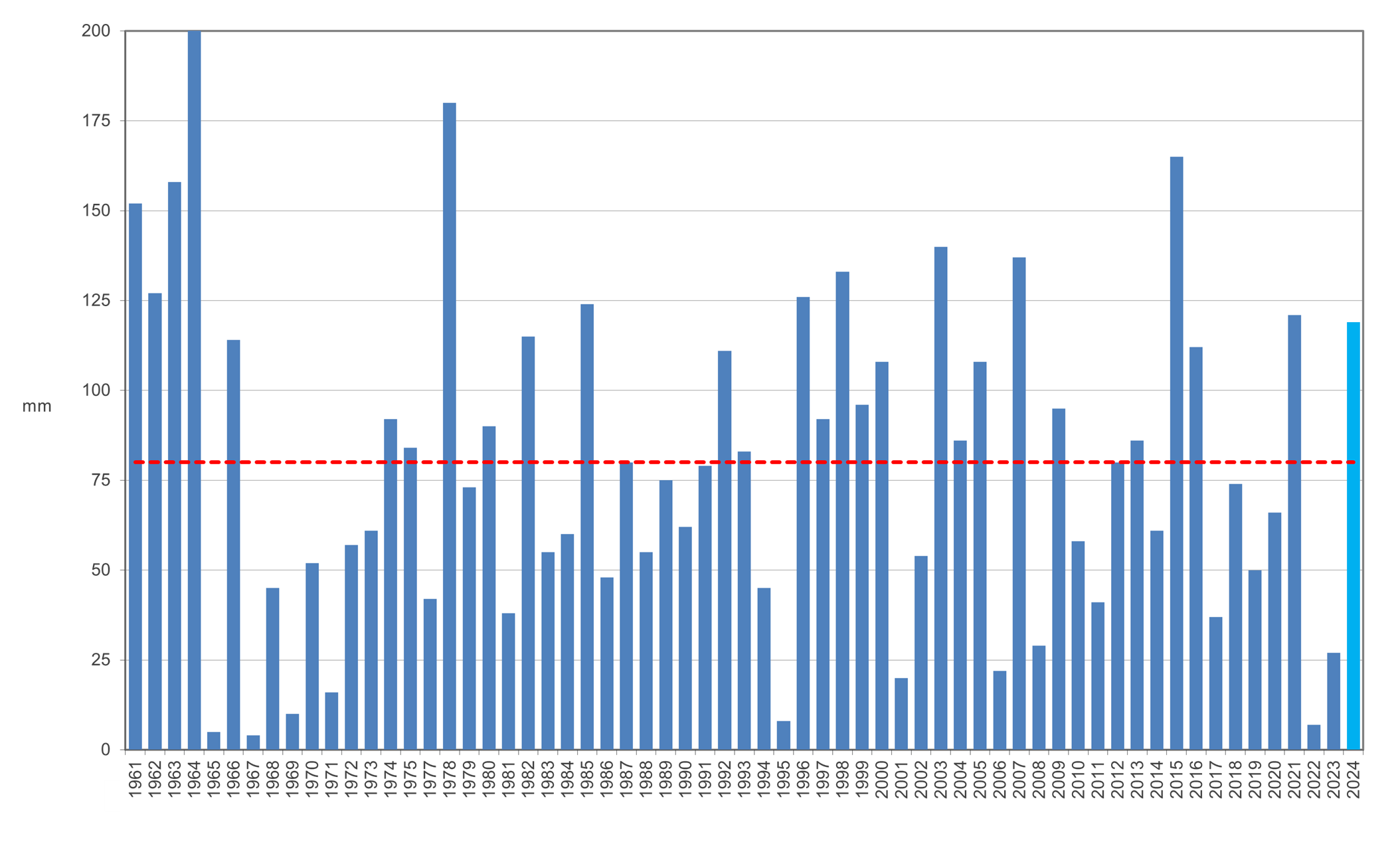Andamento precipitazione media totale regionale del mese di ottobre dal 1961 (mm); la linea tratteggiata rossa rappresenta la media 1991-2020 (mm). Il valore di ottobre torna sopra la media dopo un 2022 e un 2023 ben più secchi della norma.