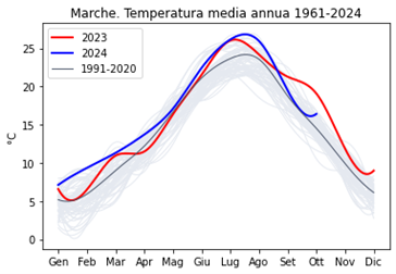 Andamento temperatura media annua regionale (°C); in blu l'anno attuale, in rosso l'anno più caldo (2023) dal 1961, in grigio marcato la media 1991-2020, tutti gli altri anni della serie storica sono rappresentati in grigio sottile. Lo scorso anno, a partire dal mese di settembre, ebbe inizio quel periodo di temperature molto elevate che poi terminò a marzo 2024. Anche l’estate 2024 è stata particolarmente calda e l’ottobre sembra riprendere questo andamento dopo un settembre in cui le temperature sono rientrate in norma.