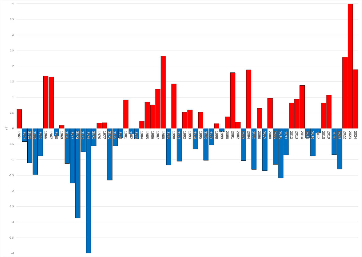 Andamento anomalia della temperatura media regionale del mese di ottobre dal 1961 rispetto alla media 1991-2020 (°C). Con il 2024 siamo giunti al terzo anno consecutivo in cui il mese di ottobre è stato più caldo del normale (l’ultimo più freddo, ottobre 2021, -1,3°C rispetto al 1991-2020).