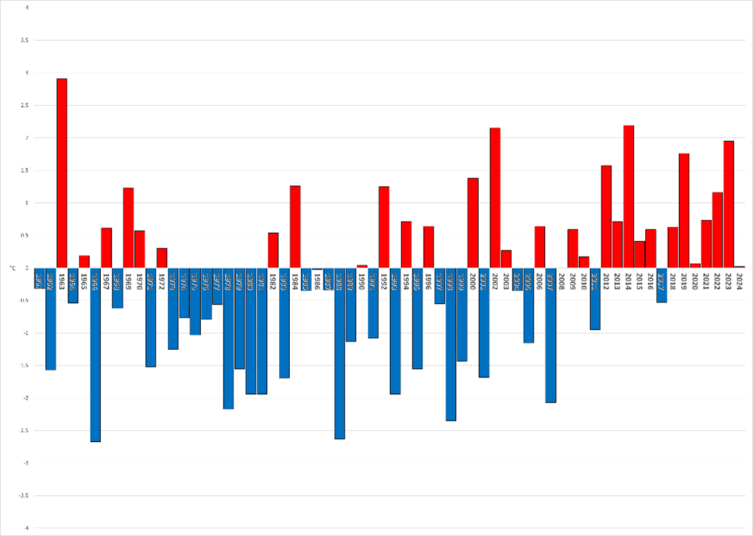 Andamento anomalia della temperatura media regionale del mese di novembre dal 1961 rispetto alla media 1991-2020 (°C). Dopo sei anni consecutivi in cui il mese di novembre è stato più caldo del normale (l’ultimo più freddo novembre 2017, -0,5°C rispetto al 1991-2020), il 2024 ha chiuso in perfetta media.