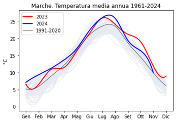 Andamento temperatura media annua regionale (°C); in blu l'anno attuale, in rosso l'anno più caldo (2023) dal 1961, in grigio marcato la media 1991-2020, tutti gli altri anni della serie storica sono rappresentati in grigio sottile. Lo scorso anno, a partire dal mese di settembre, ebbe inizio quel periodo di temperature molto elevate che poi terminò a marzo 2024. Anche l’estate 2024 è stata particolarmente calda e, dopo un ottobre con temperature superiori alla media, con novembre le temperature sono rientrate nella norma.