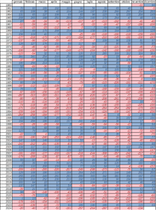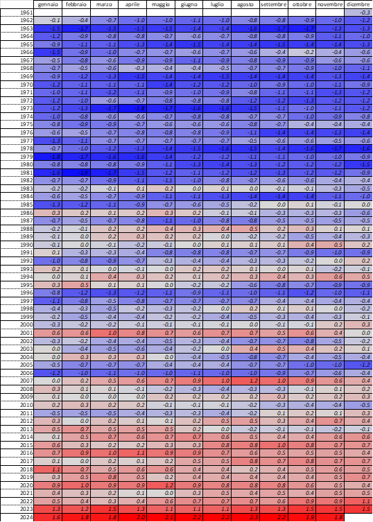 Tabella riepilogo dei valori mensili 2024, di riferimento 1991-2020 e delle anomalie.