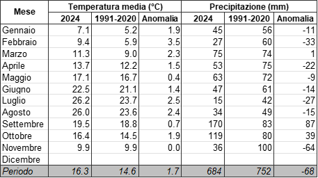 · La temperatura media da inizio anno (periodo gennaio – novembre 2024) è di 16,3°C, +1,7°C rispetto al 1991 – 2020; al momento, il 2024 si conferma come il più caldo dal 1961[6].