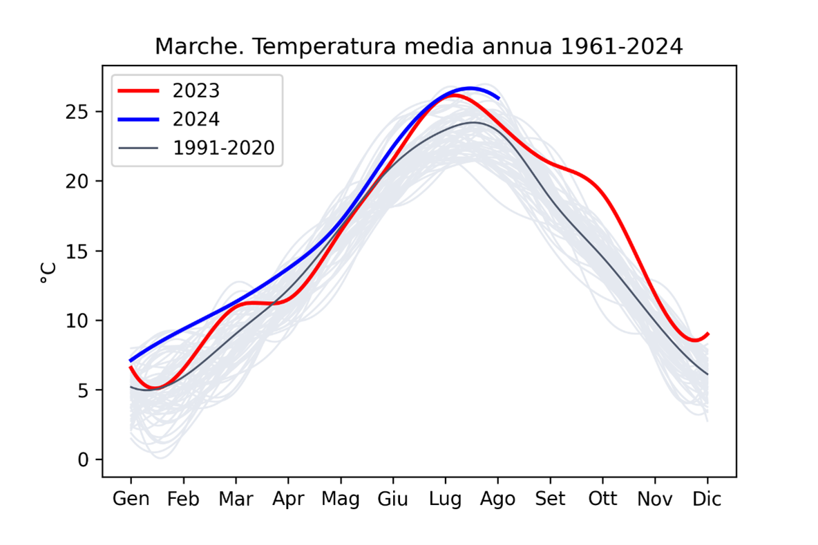 · La temperatura media degli ultimi 12 mesi (periodo settembre 2023 – agosto 2024) permane sopra la soglia dei 16°C (16,2°C) così come l’anomalia rispetto al 1991-2020 resta sopra la soglia dei +2°C (+2,3°C); tali valori rappresentano per le Marche i record annuali (anno non necessariamente solare) sempre a partire dal 1961.