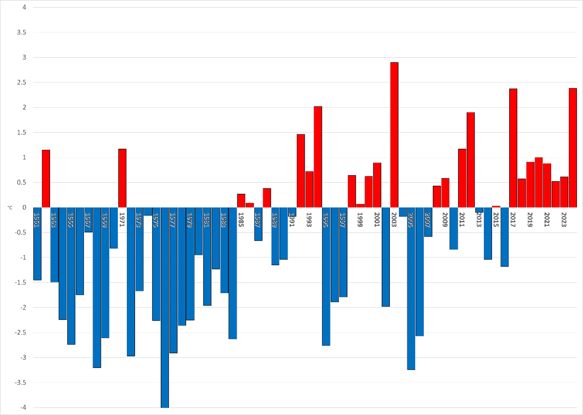 Andamento anomalia della temperatura media regionale del mese di agosto dal 1961 rispetto alla media 1991-2020 (°C). Con il 2024 siamo giunti all’ottavo anno consecutivo in cui il mese di agosto è stato più caldo del normale (l’ultimo più freddo, agosto 2016, -1,2°C rispetto al 1991-2020). Nell’intera serie, solo nel 2003 è stata registrata una temperatura media mensile superiore a quella di quest’anno.