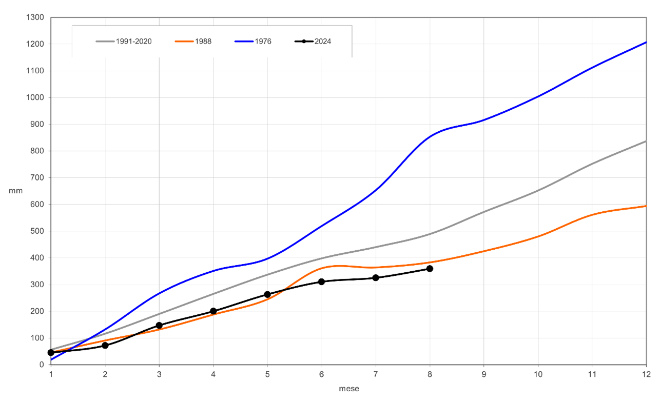 Andamento della precipitazione cumulata mensile (mm); in nero l'anno attuale, in blu l'anno più piovoso (1976) e in arancione l'anno meno piovoso (1988) dal 1961, in grigio la media 1991-2020. Il 2024 continua a ricalcare l’andamento dell’anno meno piovoso.