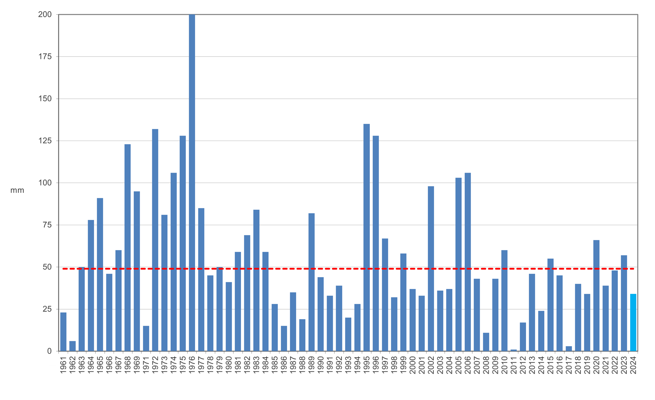 Andamento precipitazione media totale regionale del mese di agosto dal 1961 (mm); la linea tratteggiata rossa rappresenta la media 1991-2020 (mm). Il valore di agosto torna sotto la media come nel biennio 2021-2022.
