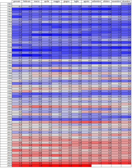 Tabella riepilogo dei valori mensili 2024, di riferimento 1991-2020 e delle anomalie.