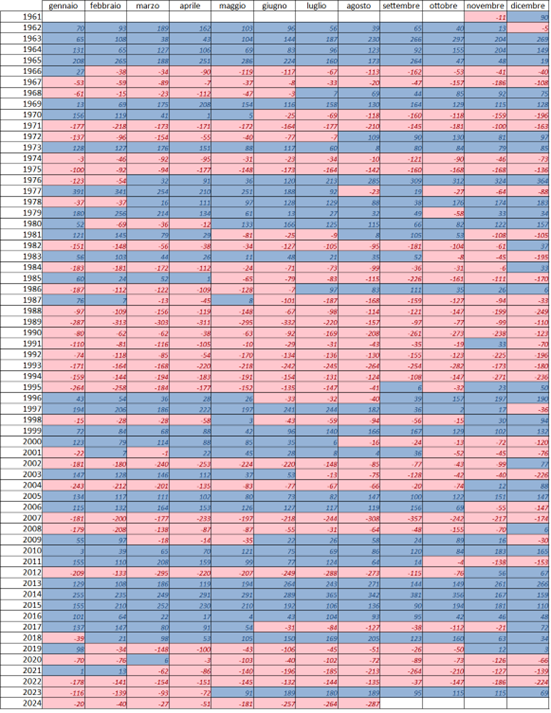 Tabella anomalie della precipitazione totale media regionale degli ultimi 12 mesi rispetto alla media dello stesso periodo del trentennio 1991-2020 (mm). Da gennaio 2024 l’anomalia è tornata su valori negativi, anomalia che andata anche accentuandosi con il passare dei mesi.