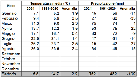 · La temperatura media da inizio anno (periodo gennaio – agosto 2024) è di 16,6°C, +1,9°C rispetto al 1991 – 2020; al momento, il 2024 si conferma come il più caldo dal 1961.