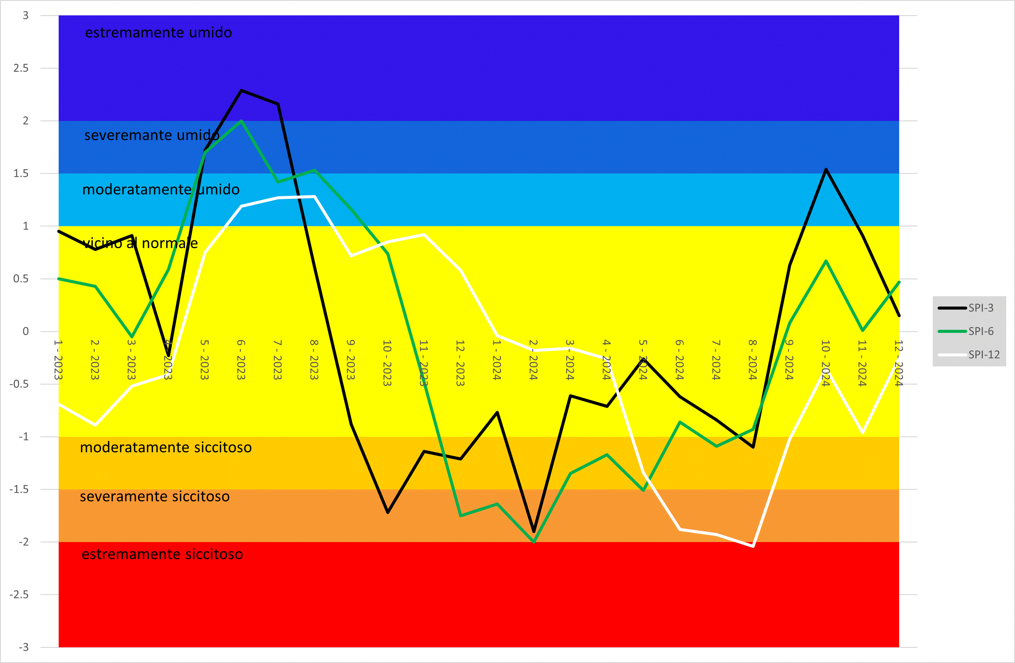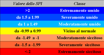 SPI-3 (indice a 3 mesi) descrive periodi siccitosi/umidi di tipo stagionale; SPI-6 (indice a 6 mesi) descrive siccità nel medio periodo; SPI-12 (indice a 12 mesi) descrive siccità annuali e prolungate.