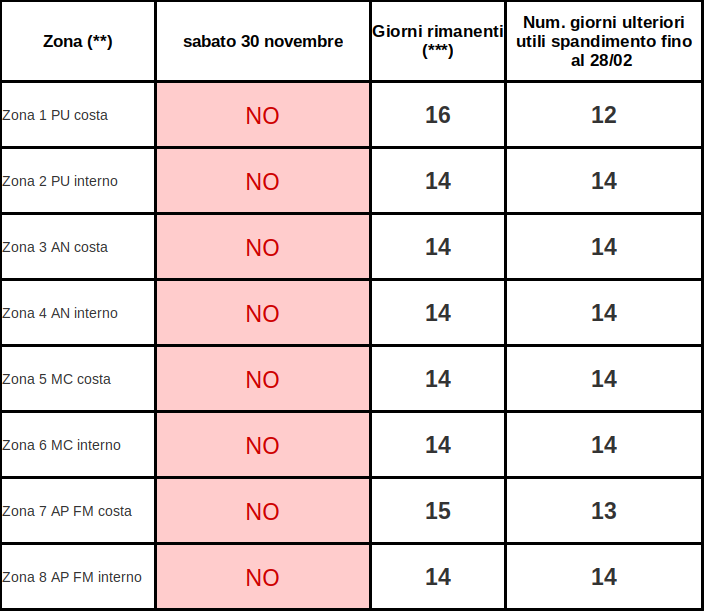 Al fine di ottimizzare, dal punto di vista agronomico, i periodi nei quali è consentito lo spandimento, anche sulla base delle esperienze degli anni precedenti, nel mese di novembre verranno comunque individuati almeno 15 giorni di divieto spandimento, così da poter comunque avere un congruo numero di giorni utili anche nel mese di febbraio.